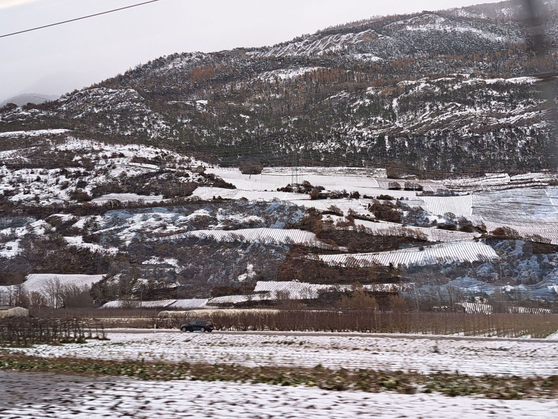 De toppen van de bergen liggen vol met sneeuw en er worden ook al sneeuwpalen geplaatst, dus misschien gaat het hier binnen een paar dagen vol liggen met sneeuw! (In Sion blijft de sneeuw wel liggen, in Lausanne nog voorlopig niet.)
